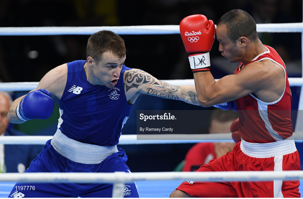 7 August 2016; Steven Donnelly of Ireland, left, in action against Zohir Kedache of Algeria during their Welterweight preliminary round of 32 bout in the Riocentro Pavillion 6 Arena, Barra da Tijuca, during the 2016 Rio Summer Olympic Games in Rio de Janeiro, Brazil. Photo by Ramsey Cardy/Sportsfile