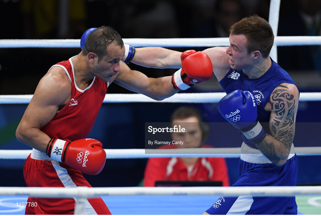 7 August 2016; Steven Donnelly of Ireland, right, in action against Zohir Kedache of Algeria during their Welterweight preliminary round of 32 bout in the Riocentro Pavillion 6 Arena, Barra da Tijuca, during the 2016 Rio Summer Olympic Games in Rio de Janeiro, Brazil. Photo by Ramsey Cardy/Sportsfile