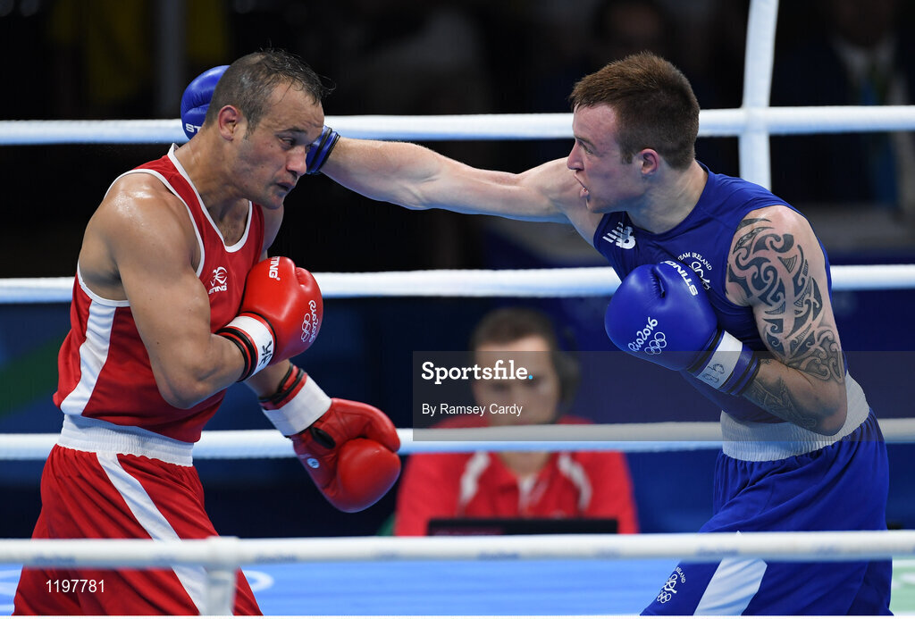 7 August 2016; Steven Donnelly of Ireland, right, in action against Zohir Kedache of Algeria during their Welterweight preliminary round of 32 bout in the Riocentro Pavillion 6 Arena, Barra da Tijuca, during the 2016 Rio Summer Olympic Games in Rio de Janeiro, Brazil. Photo by Ramsey Cardy/Sportsfile
