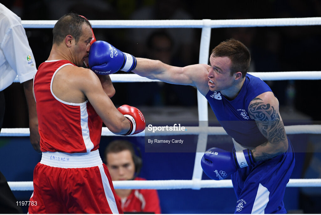 7 August 2016; Steven Donnelly of Ireland, right, in action against Zohir Kedache of Algeria during their Welterweight preliminary round of 32 bout in the Riocentro Pavillion 6 Arena, Barra da Tijuca, during the 2016 Rio Summer Olympic Games in Rio de Janeiro, Brazil. Photo by Ramsey Cardy/Sportsfile