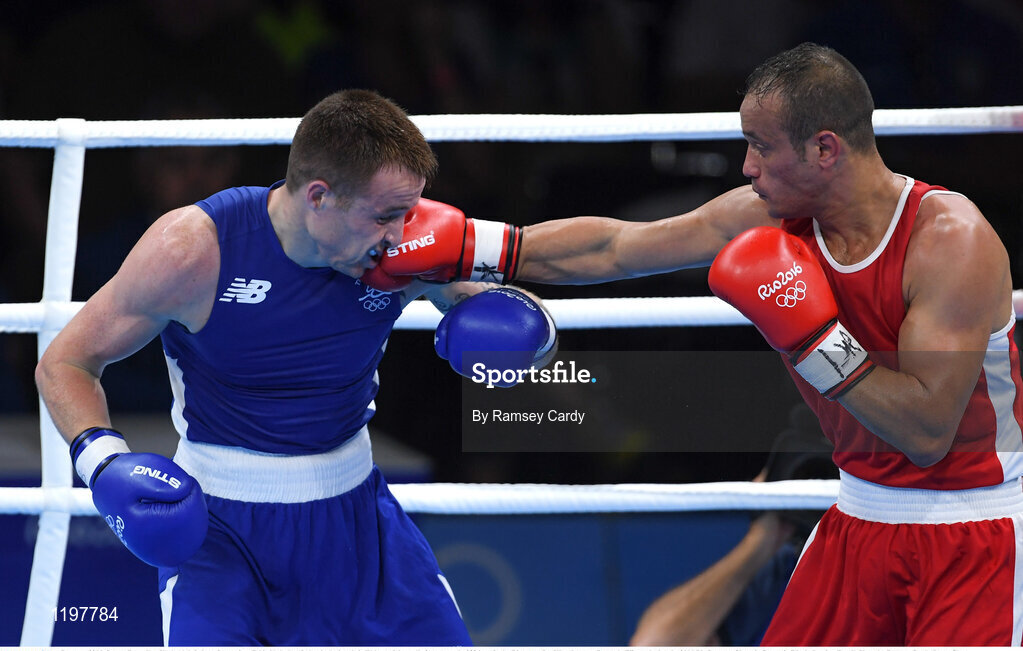 7 August 2016; Steven Donnelly of Ireland, left, in action against Zohir Kedache of Algeria during their Welterweight preliminary round of 32 bout in the Riocentro Pavillion 6 Arena, Barra da Tijuca, during the 2016 Rio Summer Olympic Games in Rio de Janeiro, Brazil. Photo by Ramsey Cardy/Sportsfile