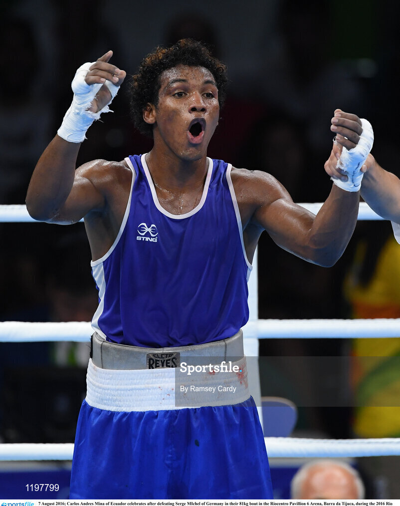7 August 2016; Carlos Andres Mina of Ecuador celebrates after defeating Serge MIchel of Germany in their 81kg bout in the Riocentro Pavillion 6 Arena, Barra da Tijuca, during the 2016 Rio Summer Olympic Games in Rio de Janeiro, Brazil. Photo by Ramsey Cardy/Sportsfile