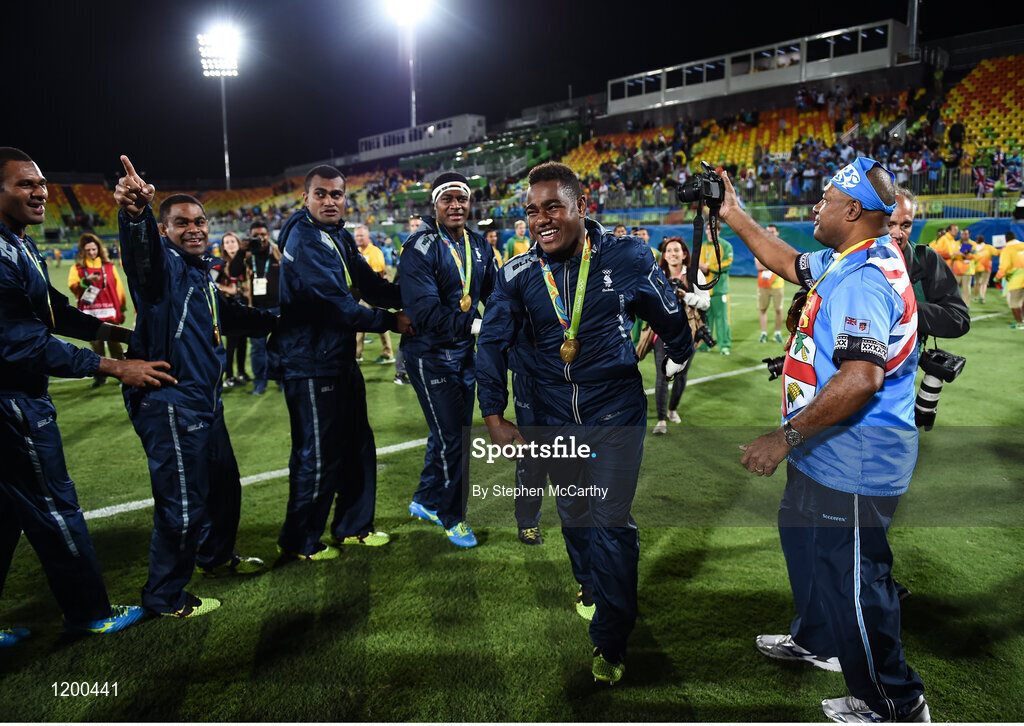 11 August 2016; Fiji players celebrare following the Men's Rugby Sevens gold medal match between Fiji and Great Britain during the 2016 Rio Summer Olympic Games at Deodoro Stadium in Rio de Janeiro, Brazil. Photo by Stephen McCarthy/Sportsfile