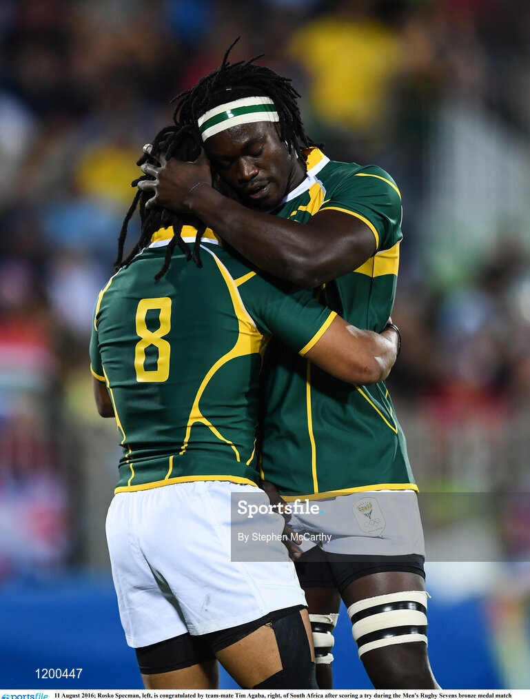 11 August 2016; Rosko Specman, left, is congratulated by team-mate Tim Agaba, right, of South Africa after scoring a try during the Men's Rugby Sevens bronze medal match between Japan and South Africa during the 2016 Rio Summer Olympic Games at Deodoro Stadium in Rio de Janeiro, Brazil. Photo by Stephen McCarthy/Sportsfile