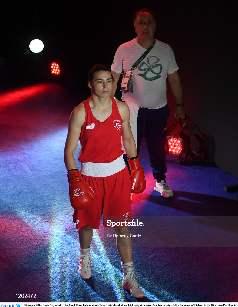 15 August 2016; Katie Taylor of Ireland and Team Ireland coach Zaur Antia ahead of her Lightweight quarter-final bout against Mira Potkonen of Finland in the Riocentro Pavillion 6 Arena, Barra da Tijuca, during the 2016 Rio Summer Olympic Games in Rio de Janeiro, Brazil. Photo by Ramsey Cardy/Sportsfile
