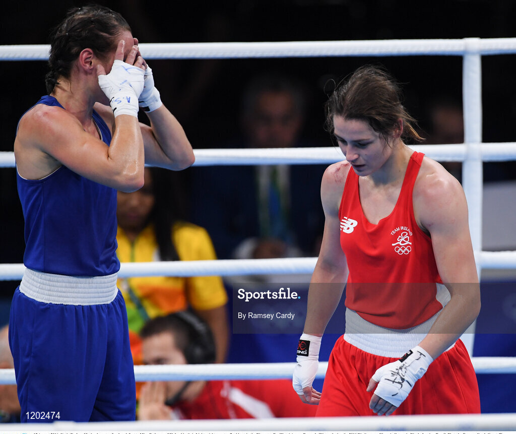 15 August 2016; Katie Taylor of Ireland reacts after her defeat to Mira Potkonen of Finland in their Lightweight quarter-final bout in the Riocentro Pavillion 6 Arena, Barra da Tijuca, during the 2016 Rio Summer Olympic Games in Rio de Janeiro, Brazil. Photo by Ramsey Cardy/Sportsfile