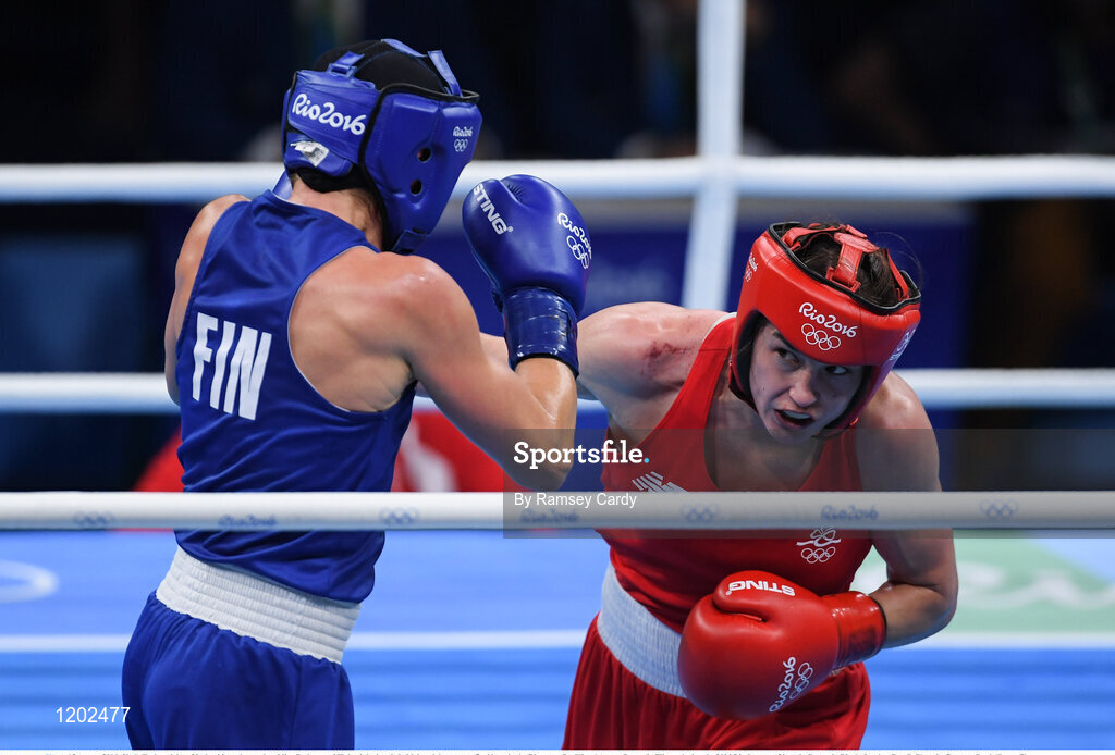 15 August 2016; Katie Taylor, right, of Ireland in action against Mira Potkonen of Finland during their Lightweight quarter-final bout in the Riocentro Pavillion 6 Arena, Barra da Tijuca, during the 2016 Rio Summer Olympic Games in Rio de Janeiro, Brazil. Photo by Ramsey Cardy/Sportsfile