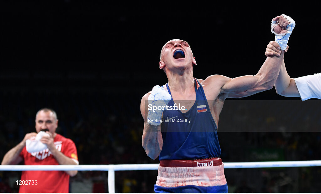 16 August 2016; Vladimir Nikitin of Russia celebrates following his Bantamweight Quarter Final bout victory over Michael Conlan of Ireland at the Riocentro Pavillion 6 Arena during the 2016 Rio Summer Olympic Games in Rio de Janeiro, Brazil. Photo by Stephen McCarthy/Sportsfile