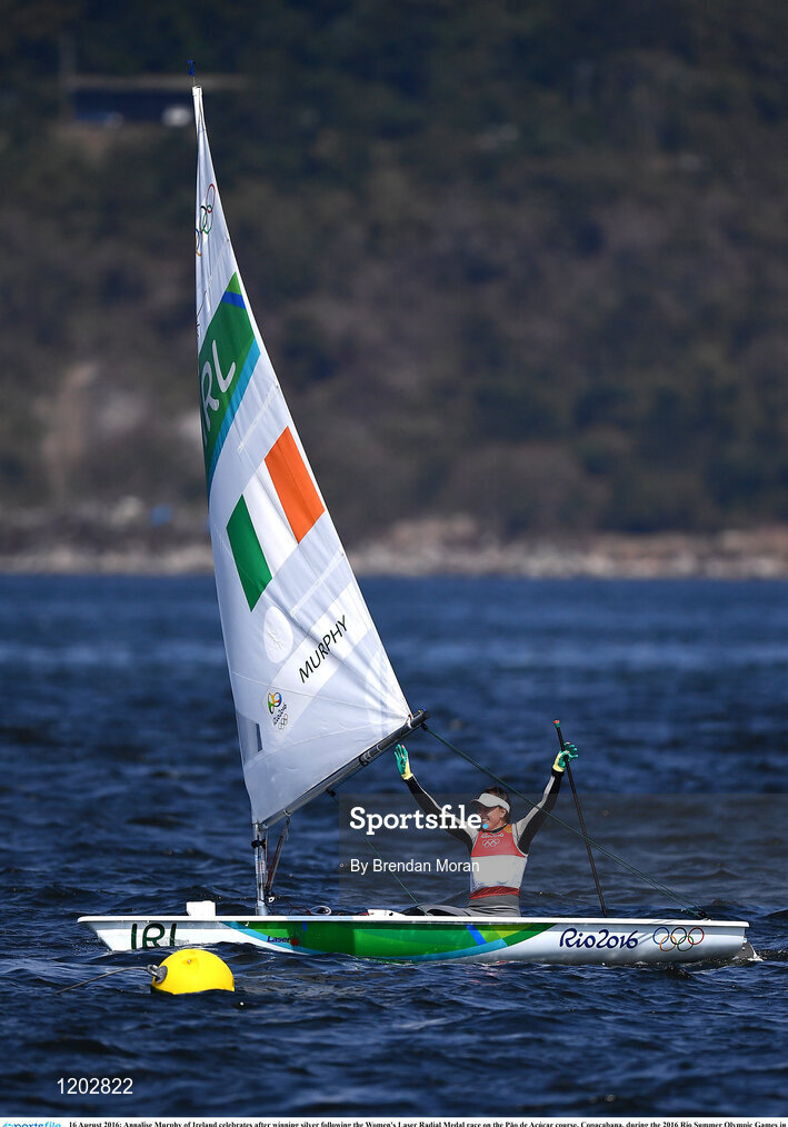 16 August 2016; Annalise Murphy of Ireland celebrates after winning silver following the Women's Laser Radial Medal race on the Pão de Açúcar course, Copacabana, during the 2016 Rio Summer Olympic Games in Rio de Janeiro, Brazil. Photo by Brendan Moran/Sportsfile