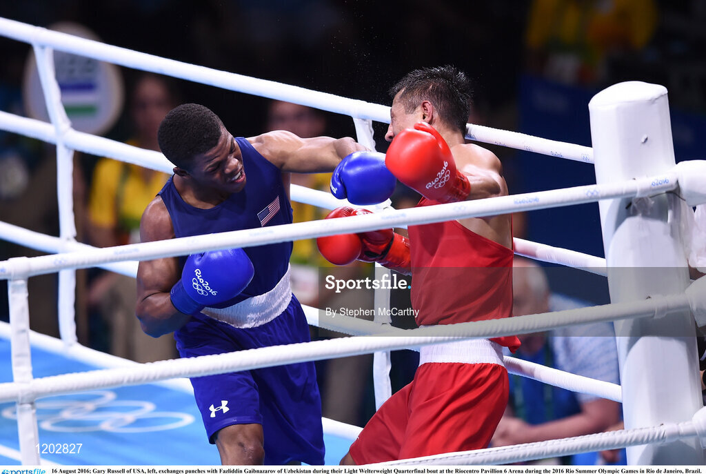 16 August 2016; Gary Russell of USA, left, exchanges punches with Fazliddin Gaibnazarov of Uzbekistan during their Light Welterweight Quarterfinal bout at the Riocentro Pavillion 6 Arena during the 2016 Rio Summer Olympic Games in Rio de Janeiro, Brazil. Photo by Stephen McCarthy/Sportsfile