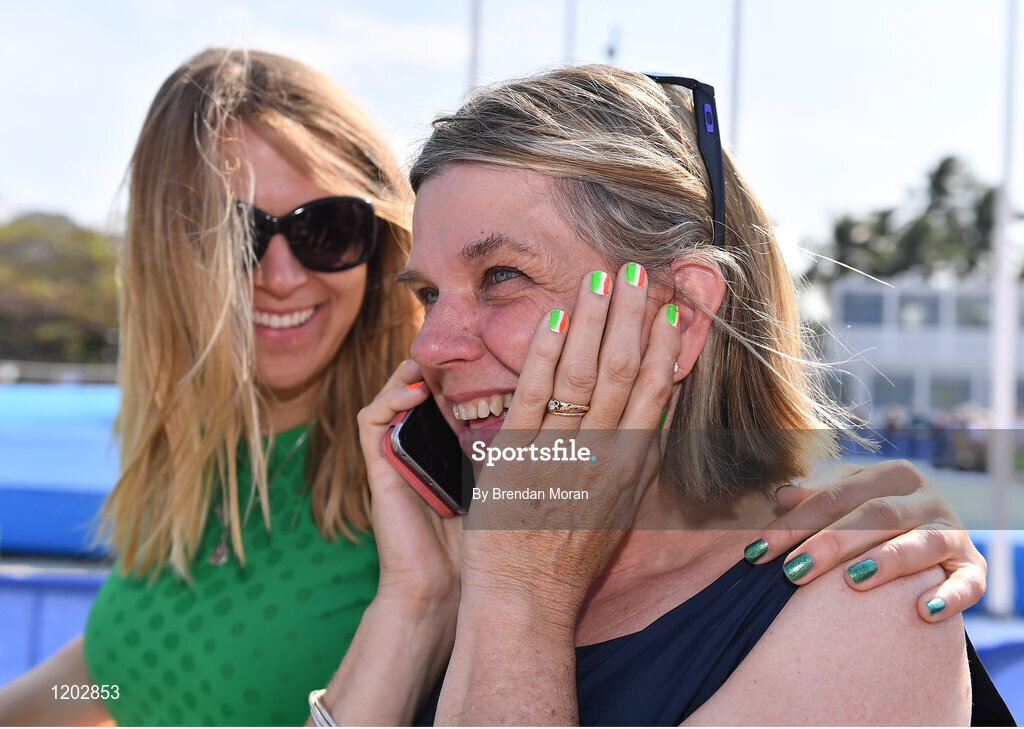 16 August 2016; Annalise Murphys sister Claudine, left, and mother Cathy MacAleavey, celebrate after Annalise won a silver medal in the Women's Laser Radial Medal race on the Pão de Açúcar course, Copacabana, during the 2016 Rio Summer Olympic Games in Rio de Janeiro, Brazil. Photo by Brendan Moran/Sportsfile