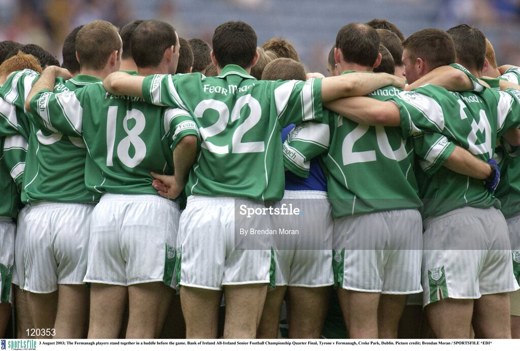 3 August 2003; The Fermanagh players stand together in a huddle before the game. Bank of Ireland All-Ireland Senior Football Championship Quarter Final, Tyrone v Fermanagh, Croke Park, Dublin. Picture credit; Brendan Moran / SPORTSFILE *EDI*