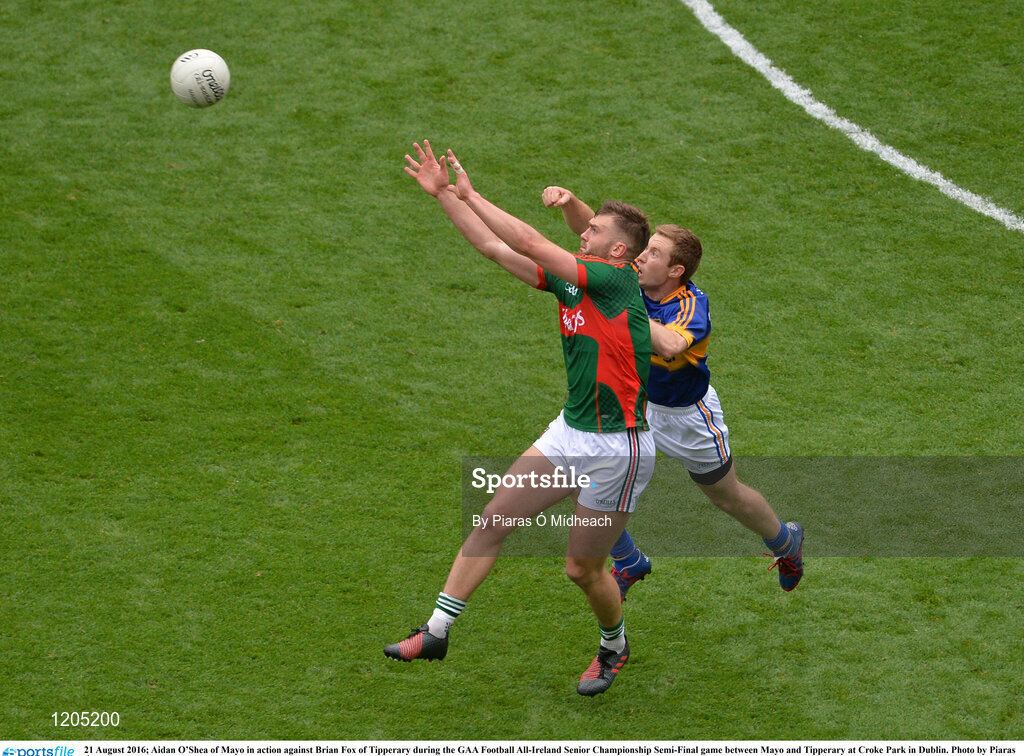 21 August 2016; Aidan O’Shea of Mayo in action against Brian Fox of Tipperary during the GAA Football All-Ireland Senior Championship Semi-Final game between Mayo and Tipperary at Croke Park in Dublin. Photo by Piaras Ó Mídheach/Sportsfile