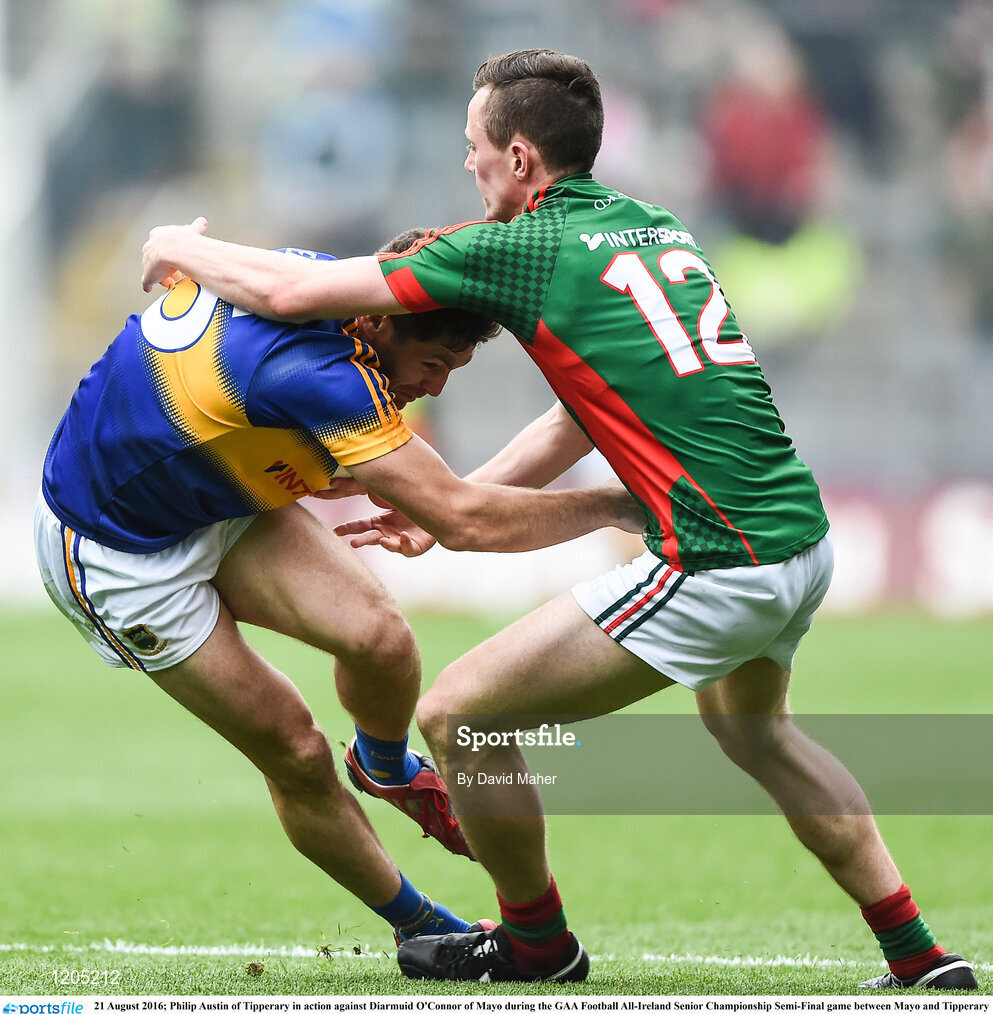 21 August 2016; Philip Austin of Tipperary in action against Diarmuid O'Connor of Mayo during the GAA Football All-Ireland Senior Championship Semi-Final game between Mayo and Tipperary at Croke Park in Dublin. Photo by David Maher/Sportsfile