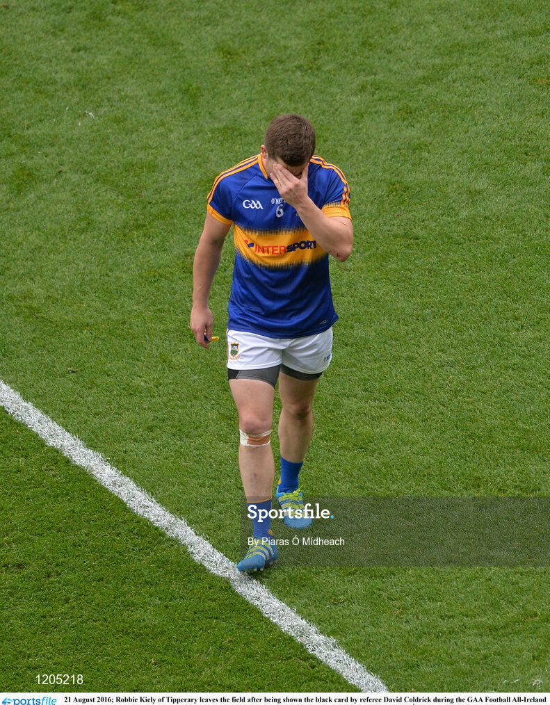 21 August 2016; Robbie Kiely of Tipperary leaves the field after being shown the black card by referee David Coldrick during the GAA Football All-Ireland Senior Championship Semi-Final game between Mayo and Tipperary at Croke Park in Dublin. Photo by Piaras Ó Mídheach/Sportsfile