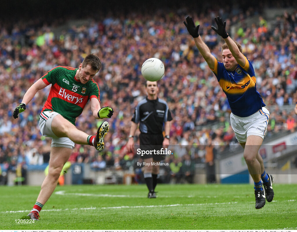 21 August 2016; Cillian O’Connor of Mayo has his shot blocked by Tipperary's Bill Maher during the GAA Football All-Ireland Senior Championship Semi-Final game between Tipperary and Mayo at Croke Park in Dublin. Photo by Ray McManus/Sportsfile