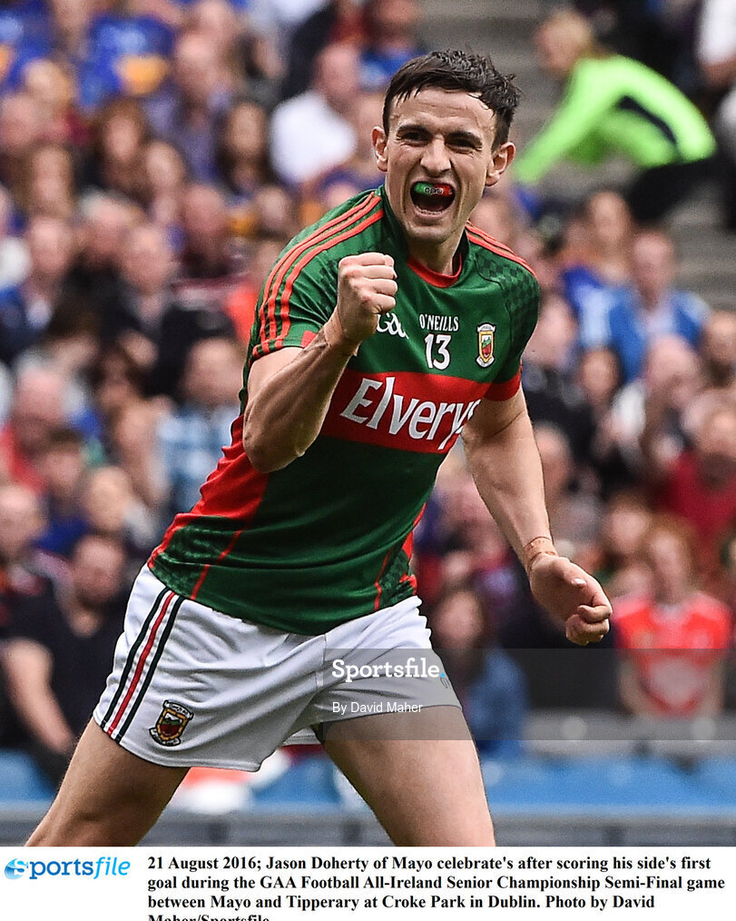 21 August 2016; Jason Doherty of Mayo celebrates after scoring his side's first goal during the GAA Football All-Ireland Senior Championship Semi-Final game between Mayo and Tipperary at Croke Park in Dublin. Photo by David Maher/Sportsfile