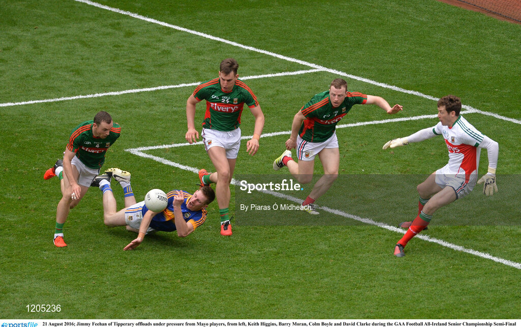 21 August 2016; Jimmy Feehan of Tipperary offloads under pressure from Mayo players, from left, Keith Higgins, Barry Moran, Colm Boyle and David Clarke during the GAA Football All-Ireland Senior Championship Semi-Final game between Mayo and Tipperary at Croke Park in Dublin. Photo by Piaras Ó Mídheach/Sportsfile