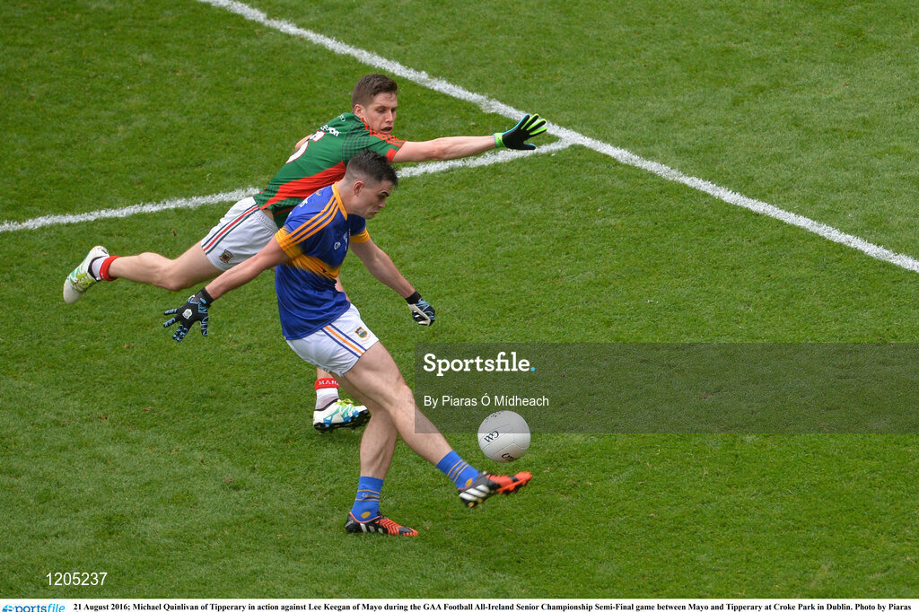21 August 2016; Michael Quinlivan of Tipperary in action against Lee Keegan of Mayo during the GAA Football All-Ireland Senior Championship Semi-Final game between Mayo and Tipperary at Croke Park in Dublin. Photo by Piaras Ó Mídheach/Sportsfile