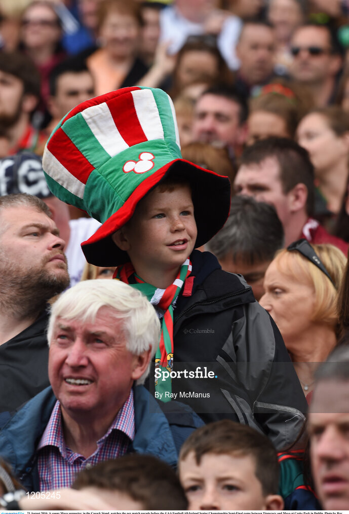 21 August 2016; A young Mayo supporter, in the Cusack Stand, watches the pre match parade before the GAA Football All-Ireland Senior Championship Semi-Final game between Tipperary and Mayo at Croke Park in Dublin. Photo by Ray McManus/Sportsfile