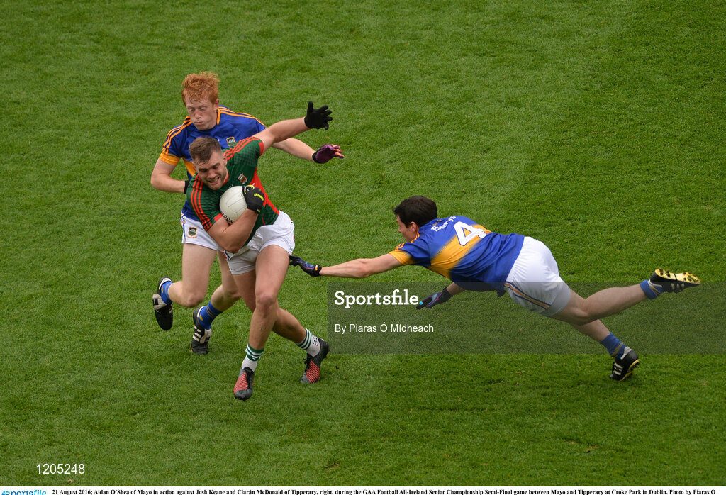 21 August 2016; Aidan O’Shea of Mayo in action against Josh Keane and Ciarán McDonald of Tipperary, right, during the GAA Football All-Ireland Senior Championship Semi-Final game between Mayo and Tipperary at Croke Park in Dublin. Photo by Piaras Ó Mídheach/Sportsfile