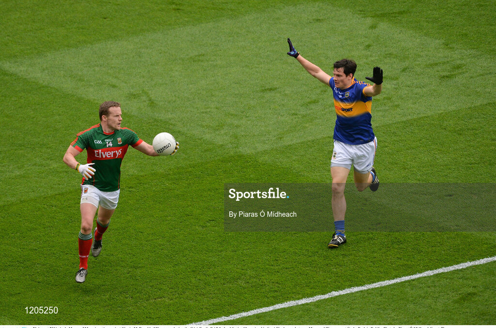 21 August 2016; Andy Moran of Mayo in action against Ciarán McDonald of Tipperary during the GAA Football All-Ireland Senior Championship Semi-Final game between Mayo and Tipperary at Croke Park in Dublin. Photo by Piaras Ó Mídheach/Sportsfile