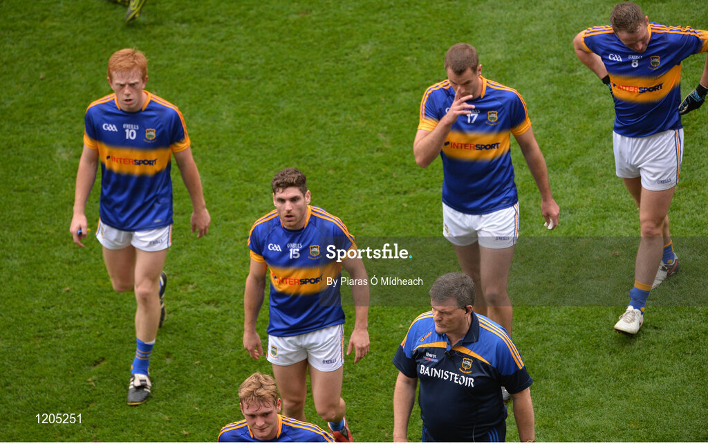 21 August 2016; Tipperary manager Liam Kearns and his players, from left, Josh Keane, Colm O’Shaughnessy, Philip Austin, Alan Moloney and Peter Acheson leave the field at half-time during the GAA Football All-Ireland Senior Championship Semi-Final game between Mayo and Tipperary at Croke Park in Dublin. Photo by Piaras Ó Mídheach/Sportsfile