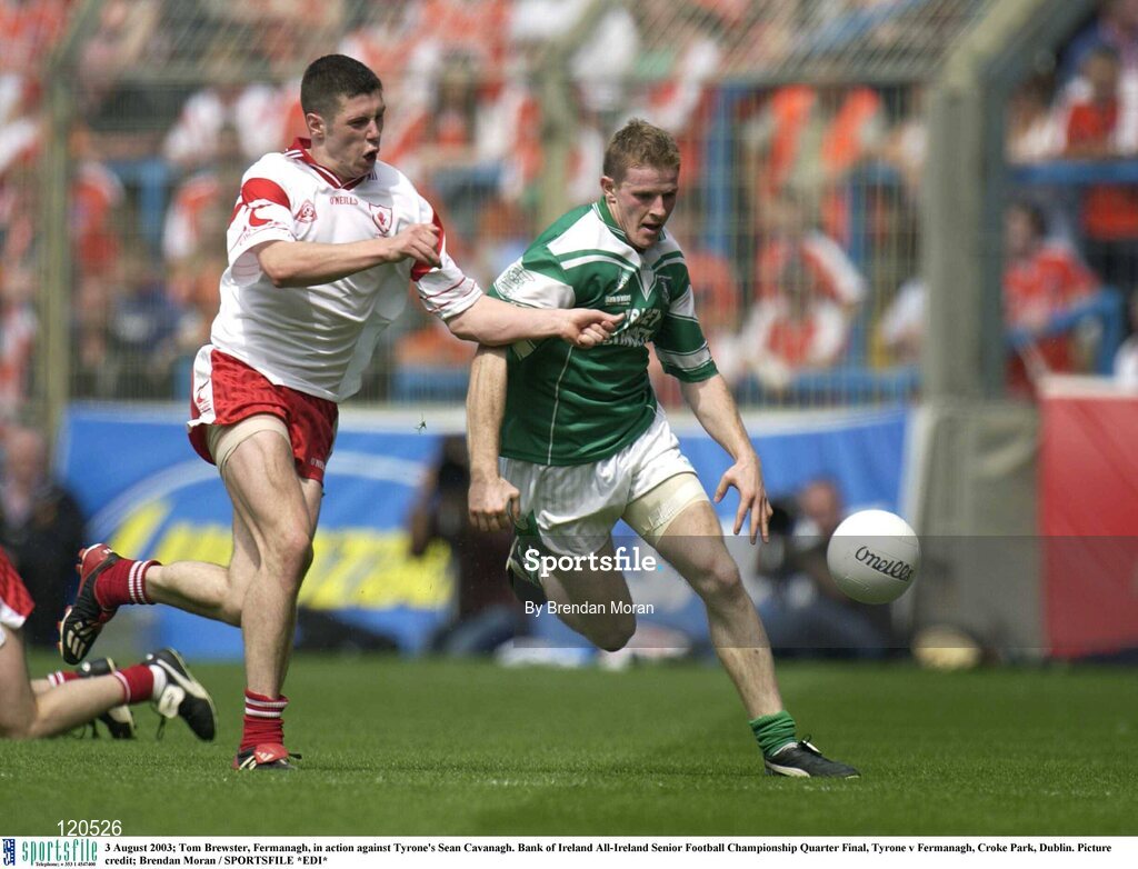 3 August 2003; Tom Brewster of Fermanagh, in action against Sean Cavanagh of Tyrone during the Bank of Ireland All-Ireland Senior Football Championship Quarter Final match between Tyrone and Fermanagh at Croke Park in Dublin. Photo by Brendan Moran/Sportsfile