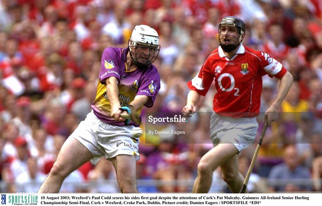 10 August 2003; Paul Codd of Wexford scores his sides first goal despite the attentions of Cork's Pat Mulcahy during the Guinness All-Ireland Senior Hurling Championship Semi-Final match between Cork and Wexford at Croke Park in Dublin. Photo by Damien Eagers/Sportsfile