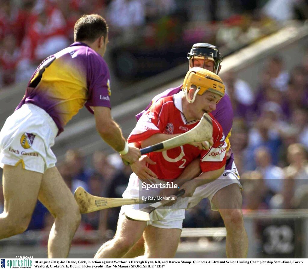 10 August 2003; Joe Deane of Cork, in action against Darragh Ryan, left, and Darren Stamp of Wexford during the Guinness All-Ireland Senior Hurling Championship Semi-Final match between Cork and Wexford at Croke Park in Dublin. Photo by Ray McManus/Sportsfile