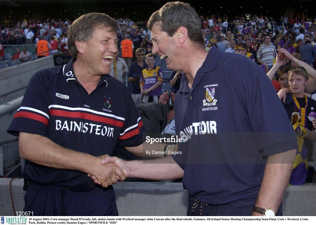 10 August 2003; Cork manager Donal O'Grady shakes hands with Wexford manager John Conran after the Guinness All-Ireland Senior Hurling Championship Semi-Final match between the Cork and Wexford at Croke Park in Dublin. Photo by Damien Eagers/Sportsfile