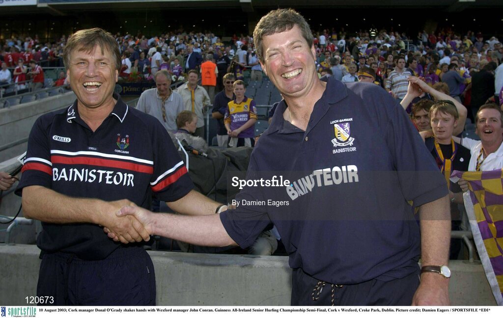 10 August 2003; Cork manager Donal O'Grady shakes hands with Wexford manager John Conran after the Guinness All-Ireland Senior Hurling Championship Semi-Final match between the Cork and Wexford at Croke Park in Dublin. Photo by Damien Eagers/Sportsfile