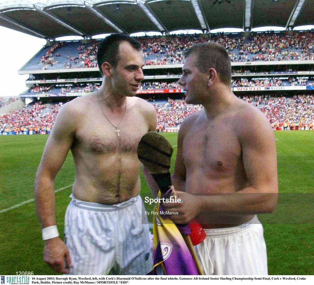 10 August 2003; Darragh Ryan of Wexford, left, with Diarmuid O'Sullivan of Cork after the final whistle of the Guinness All-Ireland Senior Hurling Championship Semi-Final match between Cork and Wexford at Croke Park in Dublin. Photo by Ray McManus/Sportsfile