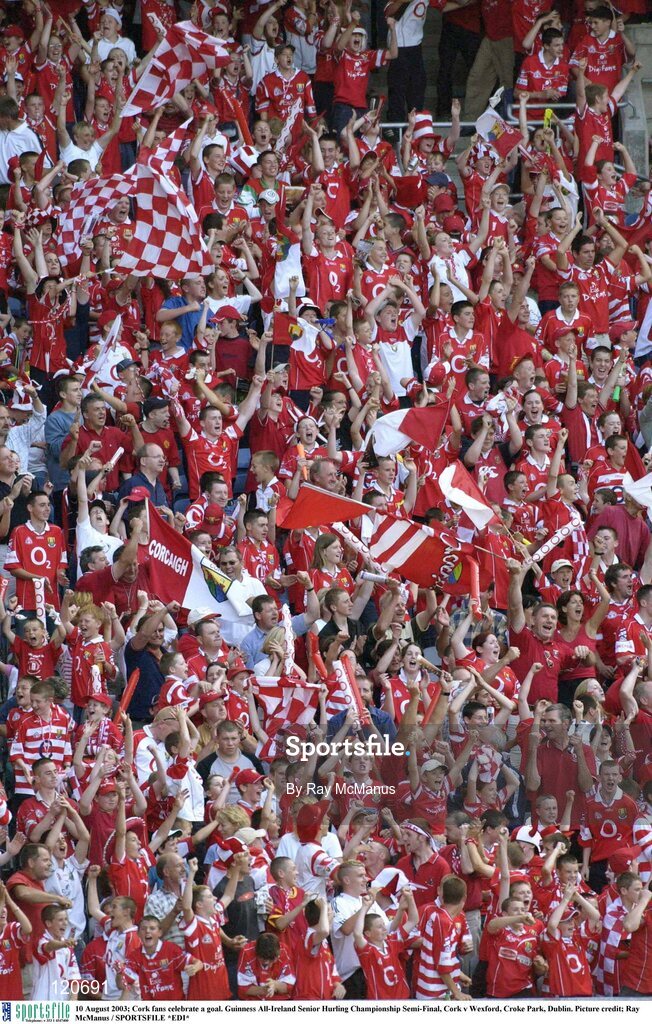 10 August 2003; Cork suppoorters celebrate a score for they team during the Guinness All-Ireland Senior Hurling Championship Semi-Final match between Cork and Wexford at Croke Park in Dublin. Photo by Ray McManus/Sportsfile