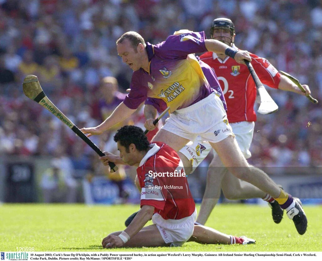 10 August 2003; Sean Og O'hAilpin of Cork, with a Paddy Power sponsored hurley, in action against Larry Murphy of Wexfordduring the Guinness All-Ireland Senior Hurling Championship Semi-Final match between Cork and Wexford at Croke Park in Dublin. Photo by Ray McManus/Sportsfile