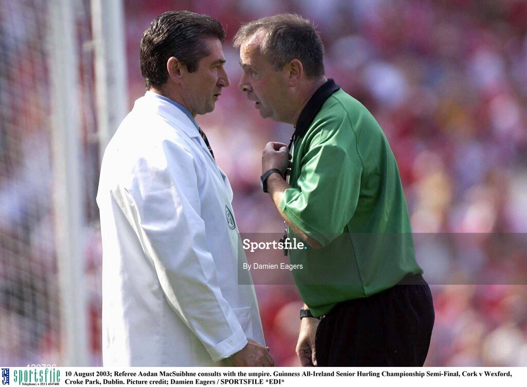 10 August 2003; Referee Aodan MacSuibhne consults with the umpire during the Guinness All-Ireland Senior Hurling Championship Semi-Final match between Cork and Wexford at Croke Park in Dublin. Photo by Damien Eagers/Sportsfile