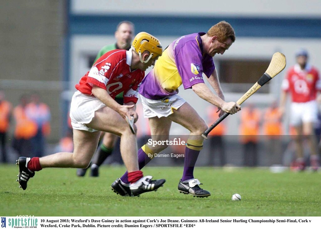 10 August 2003; Dave Guiney of Wexford in action against Joe Deane of Cork during the Guinness All-Ireland Senior Hurling Championship Semi-Final match between Cork and Wexford at Croke Park in Dublin. Photo by Damien Eagers/Sportsfile