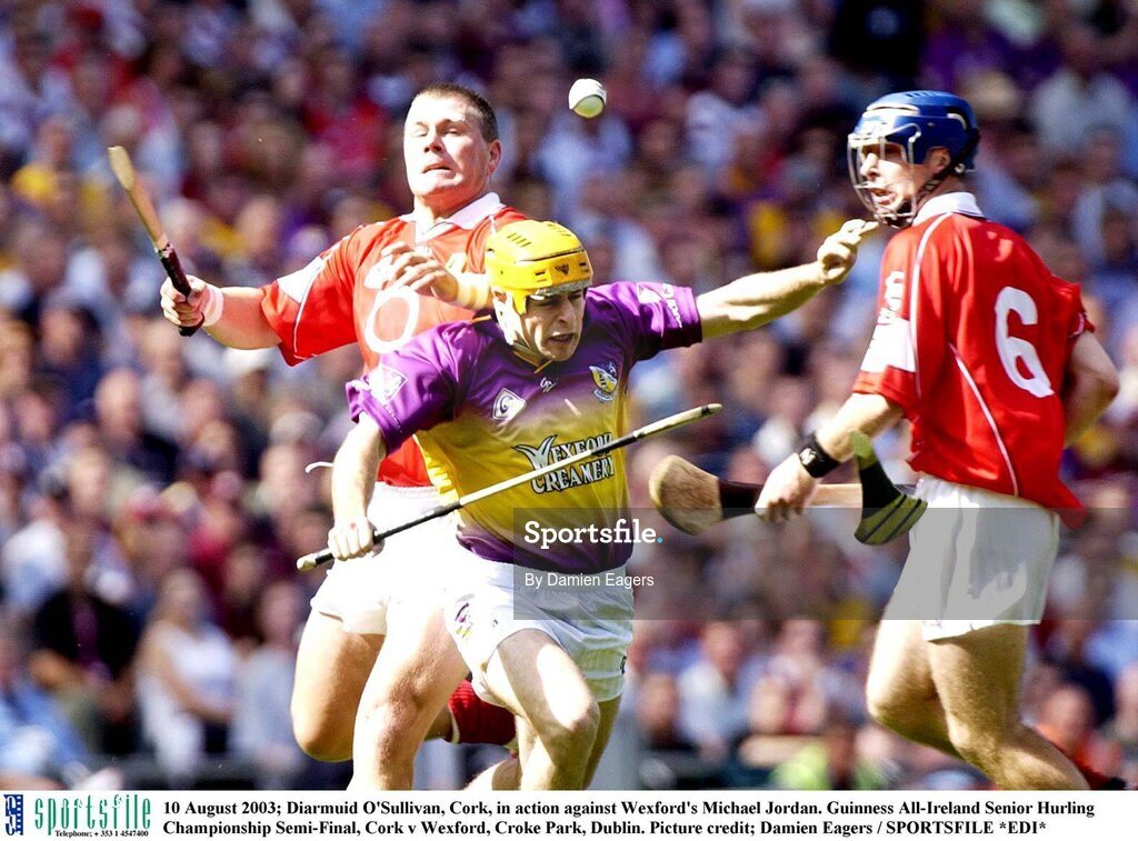 10 August 2003; Diarmuid O'Sullivan of Cork, in action against Michael Jordan of Wexford during the Guinness All-Ireland Senior Hurling Championship Semi-Final match between Cork and Wexford at Croke Park in Dublin. Photo by Damien Eagers/Sportsfile