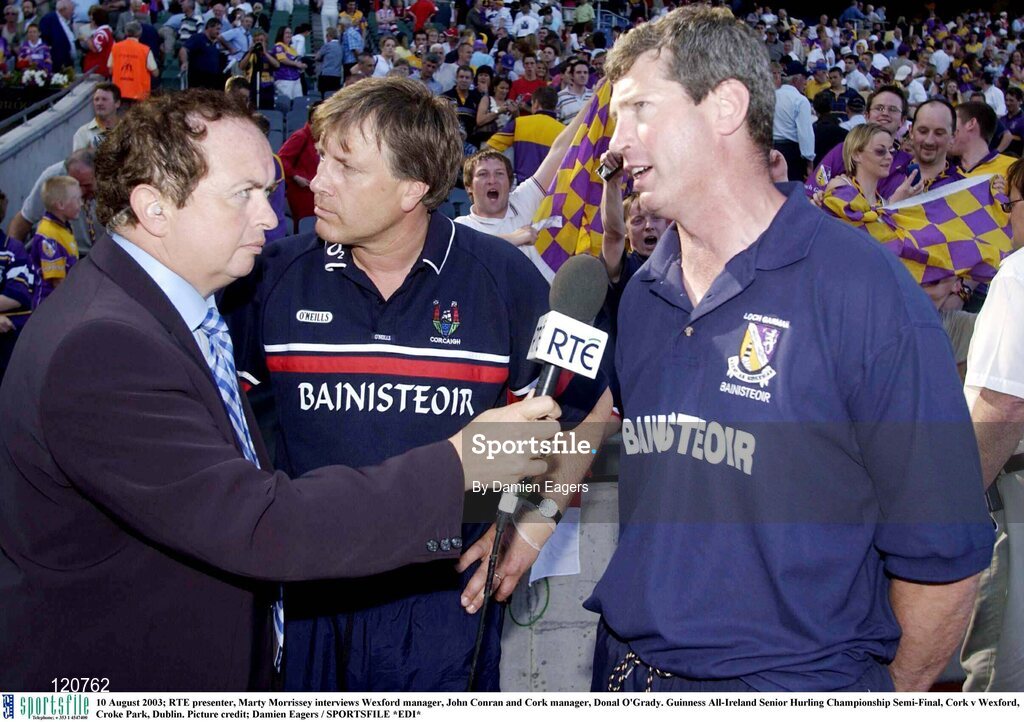 10 August 2003; RTE presenter, Marty Morrissey interviews Wexford manager John Conran and Cork manager Donal O'Grady after the Guinness All-Ireland Senior Hurling Championship Semi-Final match between Cork and Wexford at Croke Park in Dublin. Photo by Damien Eagers/Sportsfile