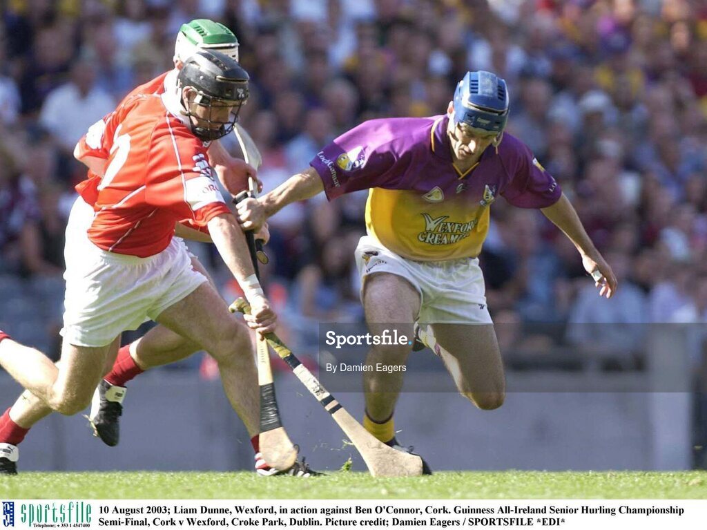 10 August 2003; Liam Dunne of Wexford, in action against Ben O'Connor of Cork during the Guinness All-Ireland Senior Hurling Championship Semi-Final match between Cork and Wexford at Croke Park in Dublin. Photo by Damien Eagers/Sportsfile