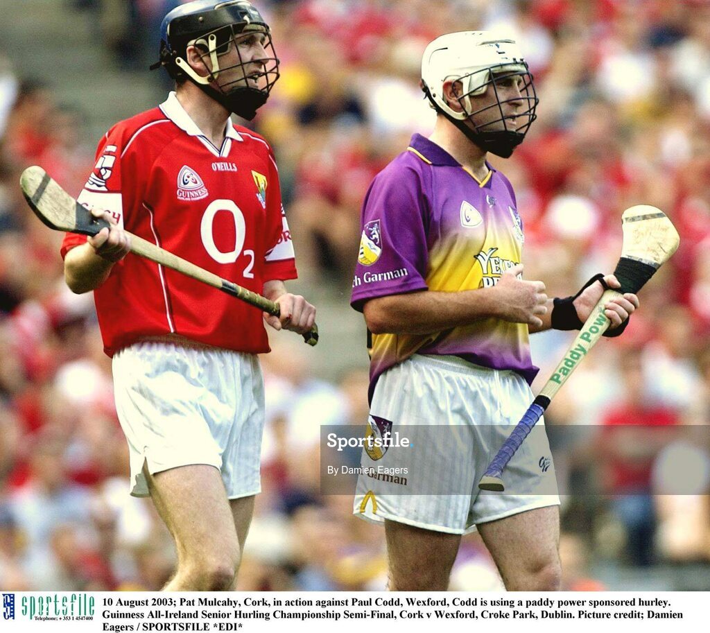 10 August 2003; Pat Mulcahy of Cork, left, and Paul Codd of Wexford, who is using a paddy power sponsored hurley during the Guinness All-Ireland Senior Hurling Championship Semi-Final match between Cork and Wexford at Croke Park in Dublin. Photo by Damien Eagers/Sportsfile