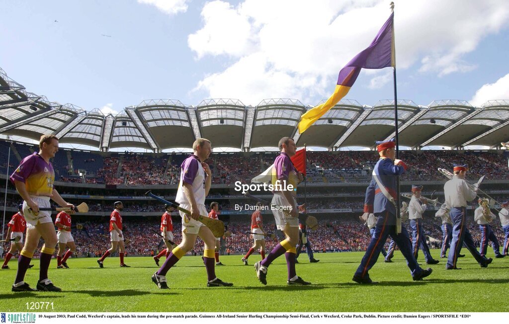 10 August 2003; Wexford's captain Paul Codd leads his team during the pre-match parade before the Guinness All-Ireland Senior Hurling Championship Semi-Final match between Cork and Wexford at Croke Park in Dublin. Photo by Damien Eagers/Sportsfile