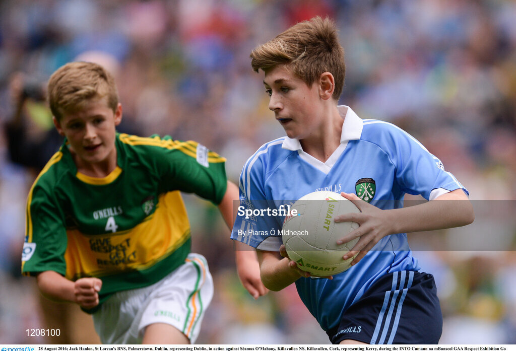 28 August 2016; Jack Hanlon, St Lorcan's BNS, Palmerstown, Dublin, representing Dublin, in action against Séamus O'Mahony, Killavullen NS, Killavullen, Cork, representing Kerry, during the INTO Cumann na mBunscol GAA Respect Exhibition Go Games at the GAA Football All-Ireland Senior Championship Semi-Final game between Dublin and Kerry at Croke Park in Dublin. Photo by Piaras Ó Mídheach/Sportsfile