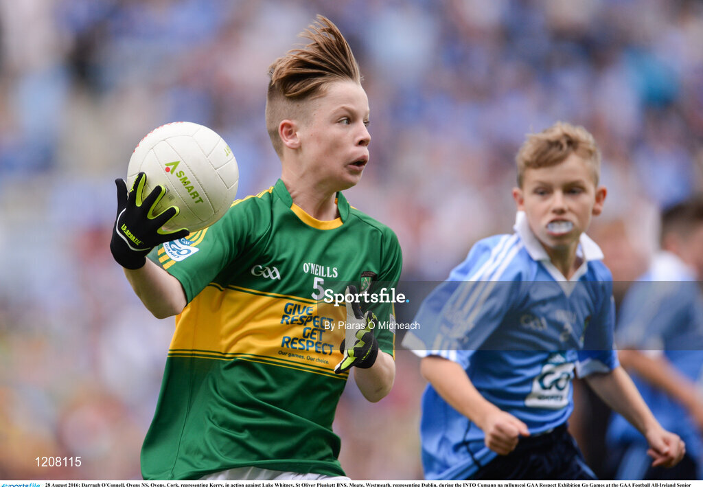 28 August 2016; Darragh O'Connell, Ovens NS, Ovens, Cork, representing Kerry, in action against Luke Whitney, St Oliver Plunkett BNS, Moate, Westmeath, representing Dublin, during the INTO Cumann na mBunscol GAA Respect Exhibition Go Games at the GAA Football All-Ireland Senior Championship Semi-Final game between Dublin and Kerry at Croke Park in Dublin. Photo by Piaras Ó Mídheach/Sportsfile