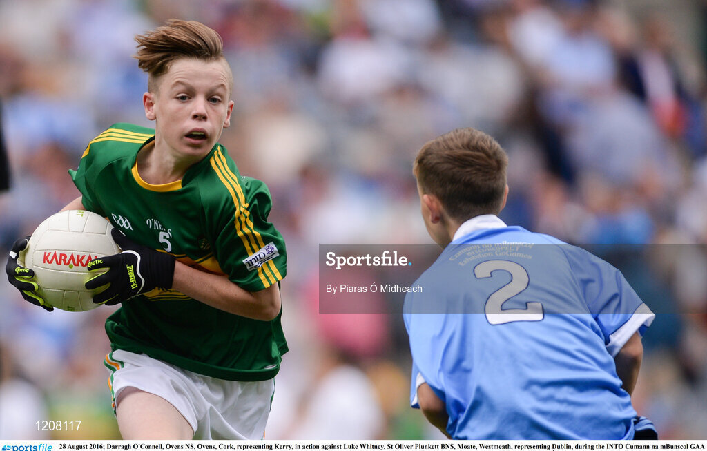 28 August 2016; Darragh O'Connell, Ovens NS, Ovens, Cork, representing Kerry, in action against Luke Whitney, St Oliver Plunkett BNS, Moate, Westmeath, representing Dublin, during the INTO Cumann na mBunscol GAA Respect Exhibition Go Games at the GAA Football All-Ireland Senior Championship Semi-Final game between Dublin and Kerry at Croke Park in Dublin. Photo by Piaras Ó Mídheach/Sportsfile