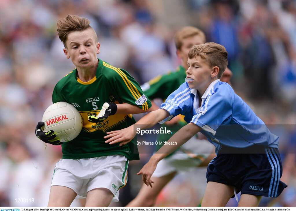 28 August 2016; Darragh O'Connell, Ovens NS, Ovens, Cork, representing Kerry, in action against Luke Whitney, St Oliver Plunkett BNS, Moate, Westmeath, representing Dublin, during the INTO Cumann na mBunscol GAA Respect Exhibition Go Games at the GAA Football All-Ireland Senior Championship Semi-Final game between Dublin and Kerry at Croke Park in Dublin. Photo by Piaras Ó Mídheach/Sportsfile