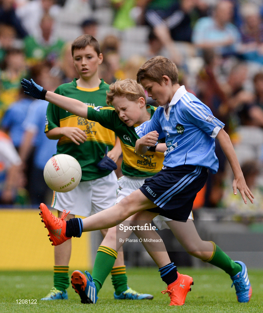 28 August 2016; Liam Osbourne, St Finnian's NS, Dunleer, Louth, representing Dublin, in action against Patrick Magee, St Colmban's, Belcoo, Fermanagh, representing Kerry, during the INTO Cumann na mBunscol GAA Respect Exhibition Go Games at the GAA Football All-Ireland Senior Championship Semi-Final game between Dublin and Kerry at Croke Park in Dublin. Photo by Piaras Ó Mídheach/Sportsfile