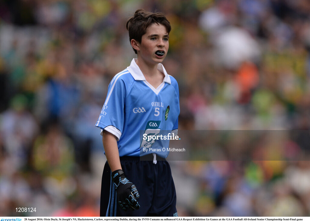 28 August 2016; Oisín Doyle, St Joseph's NS, Hacketstown, Carlow, representing Dublin, during the INTO Cumann na mBunscol GAA Respect Exhibition Go Games at the GAA Football All-Ireland Senior Championship Semi-Final game between Dublin and Kerry at Croke Park in Dublin. Photo by Piaras Ó Mídheach/Sportsfile