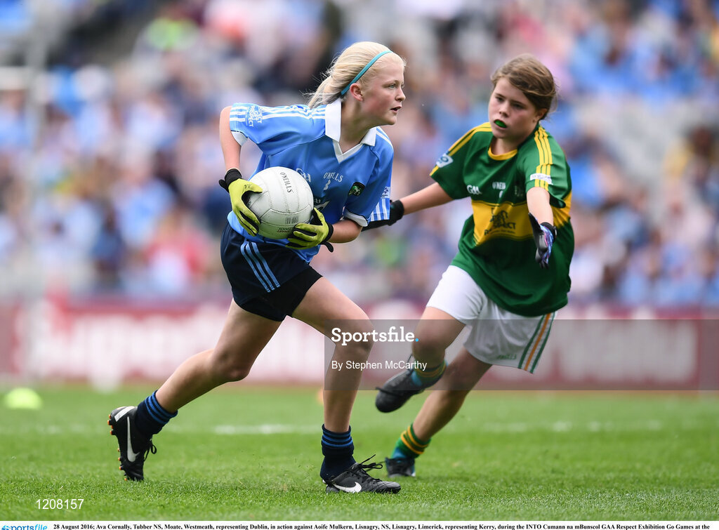 28 August 2016; Ava Cornally, Tubber NS, Moate, Westmeath, representing Dublin, in action against Aoife Mulkern, Lisnagry, NS, Lisnagry, Limerick, representing Kerry, during the INTO Cumann na mBunscol GAA Respect Exhibition Go Games at the GAA Football All-Ireland Senior Championship Semi-Final game between Dublin and Kerry at Croke Park in Dublin. Photo by Stephen McCarthy/Sportsfile