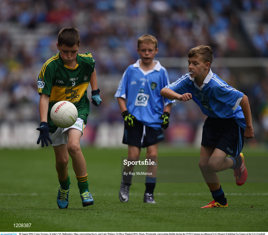 28 August 2016; Conor Sweeney, St John's NS, Ballisodare, Sligo, representing Kerry, and Luke Whitney, St Oliver Plunkett BNS, Moate, Westmeath, representing Dublin during the INTO Cumann na mBunscol GAA Respect Exhibition Go Games at the GAA Football All-Ireland Senior Championship Semi-Final game between Dublin and Kerry at Croke Park in Dublin. Photo by Ray McManus/Sportsfile